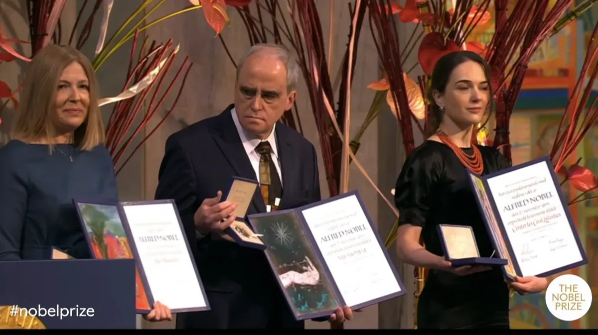 Natalya Pinchuk of Belarus, Yan Rachinsky of Russia, and Oleksandra Matviichuk of Ukraine have received their Nobel Peace Prize medals in Oslo.
