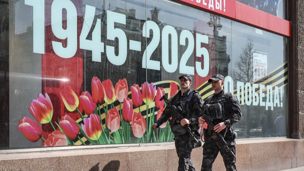 Police officers walk in front of a shop window decorated for the upcoming Victory Day celebrations in Moscow, Russia, 18 April 2025. Photo: EPA-EFE/YURI KOCHETKOV