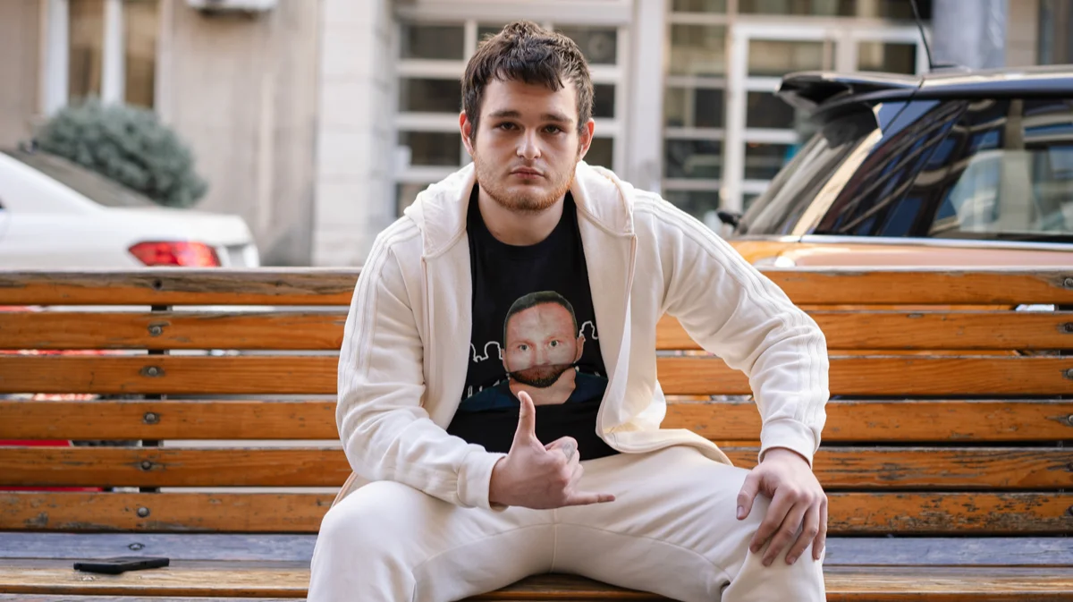 Абасов на фоне графити с флагом России, Белград, 2022 год. Фото с личной страницы героя в VK
