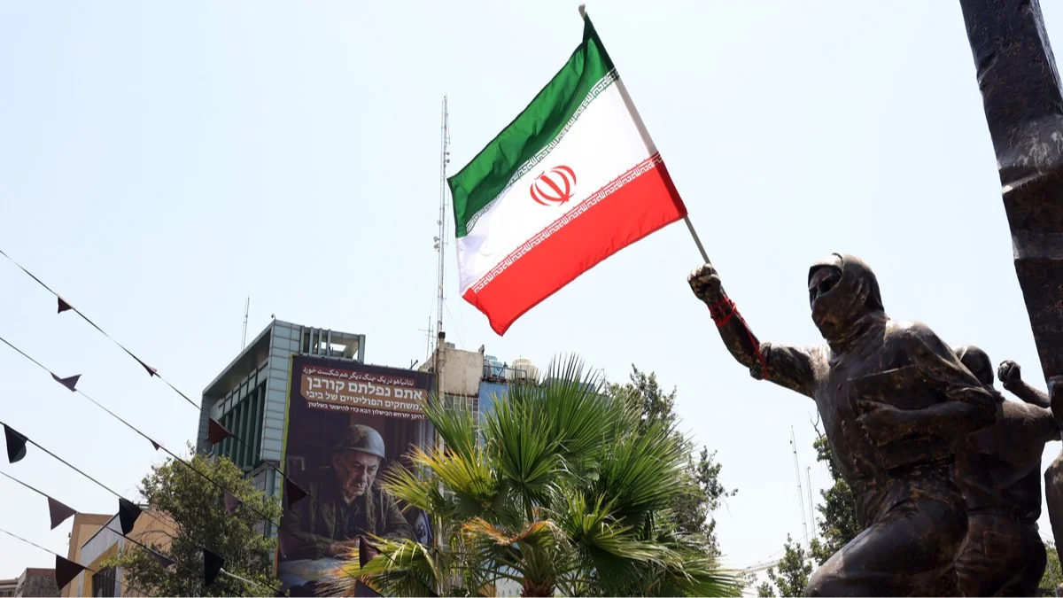 Иранский флаг на площади Палестины в Тегеране, Иран, 8 июля 2025 года. Фото: Abedin Taherkenareh / EPA