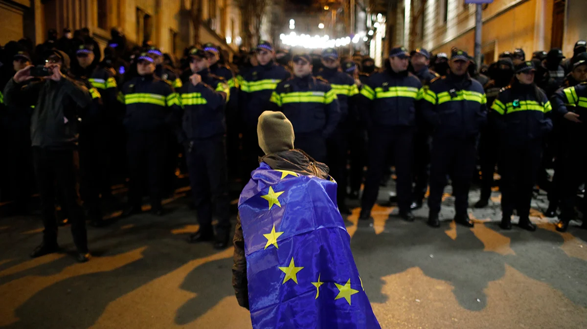Человек с флагом ЕС напротив полицейского кордона, Тбилиси, Грузия, 24 ноября 2024 года. Фото: David Mdzinarishvili / EPA