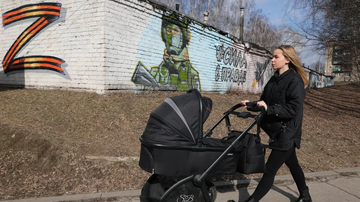 A woman pushes her baby past pro-Kremlin street art in the Moscow region town of Pavlovsky Posad, Russia, 14 March 2025. Photo: EPA / MAXIM SHIPENKOV