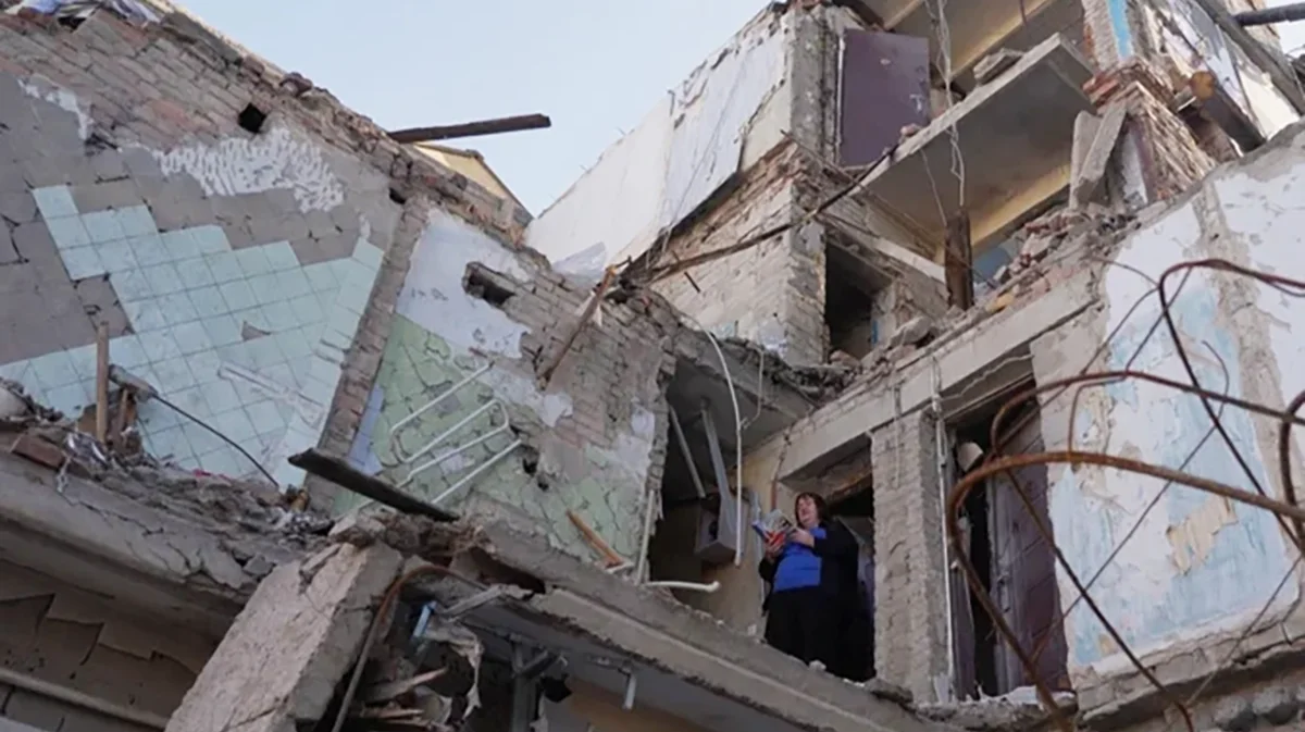 Вокруг забитые фанерой окна и частично разрушенные дома. Несколько дней назад россияне в очередной раз ударили по разрушенной гостинице возле церкви.