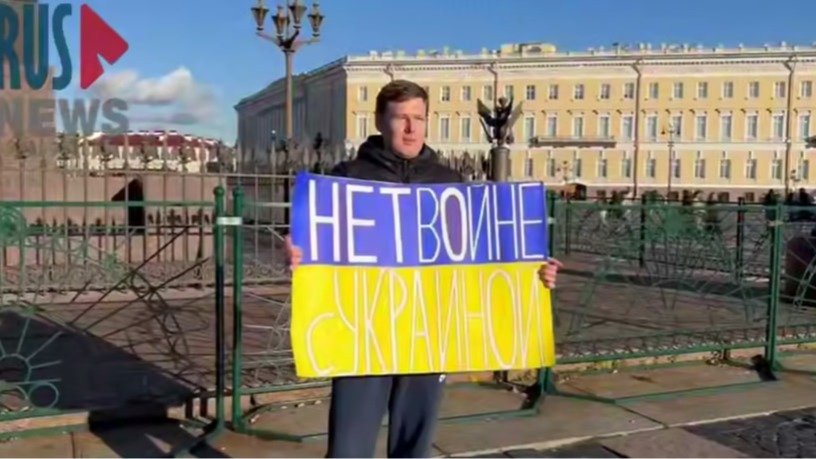 A Russian activist has been detained after staging a one-man picket on Palace Square in St. Petersburg, carrying a banner in the colours of the Ukrainian flag reading “No to war with Ukraine”, independent news outlet RusNews reported on Friday.