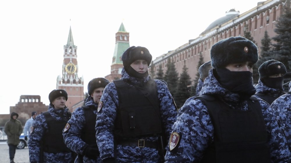 Russian police officers patrol the Red Square on 2 January 2024. Photo: EPA/MAXIM SHIPENKOV