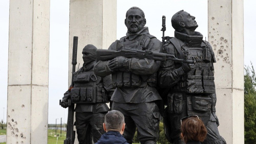 People look at the newly unveiled monument to the ‘Heroes of the Special Military Operation’ by sculptor Meiram Baimukhanov, in Kudrovo, outside St. Petersburg, Russia, 15 September 2025. EPA/ANATOLY MALTSEV
