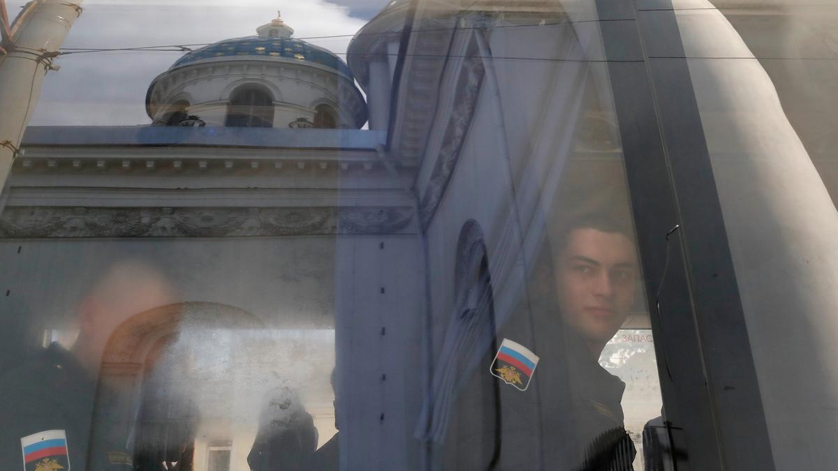 Russian conscripts depart for basic military training from outside St. Petersburg’s Trinity Cathedral, 23 May 2023. Photo: EPA / Anatoly Maltsev