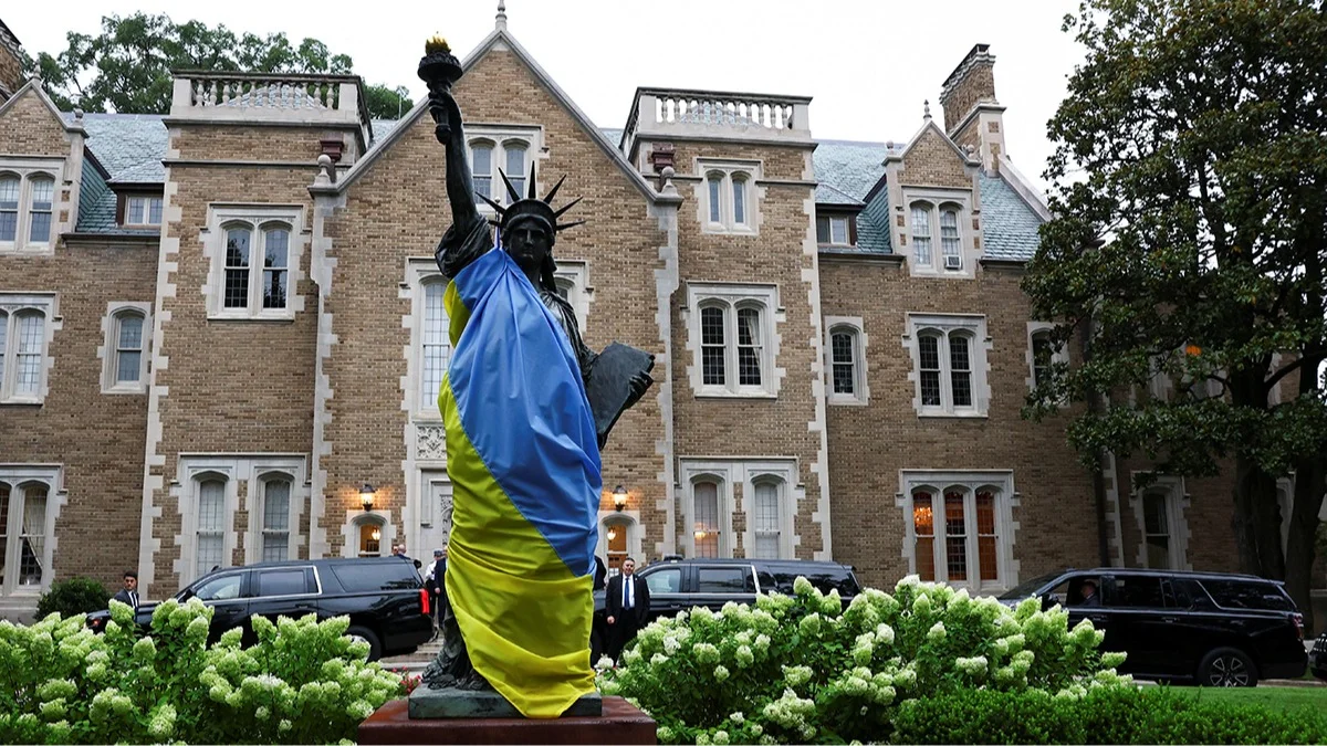 Масштабная модель Статуи Свободы, задрапированная украинским флагом, выставлена в саду посольства Франции в Вашингтоне, округ Колумбия, США, 18 августа 2025 года. Фото: Yves Herman / EPA