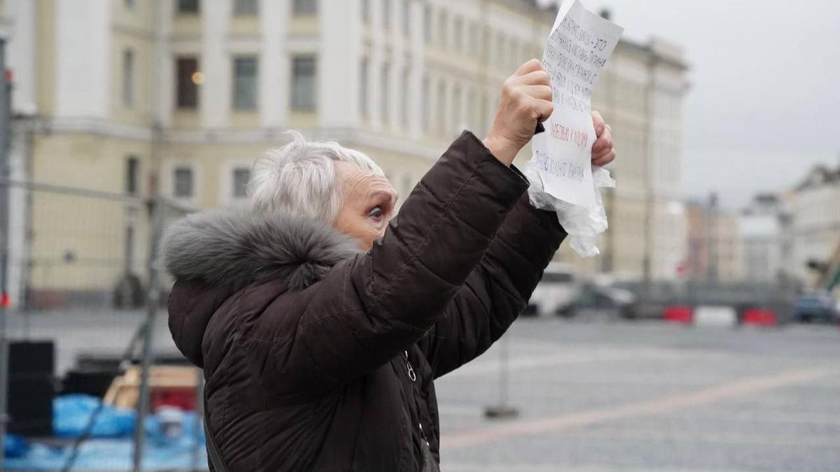 Lyudmila Vasilyeva holds up her anti-war sign on Palace Square in St. Petersburg, 30 November 2025. Photo: Bumaga