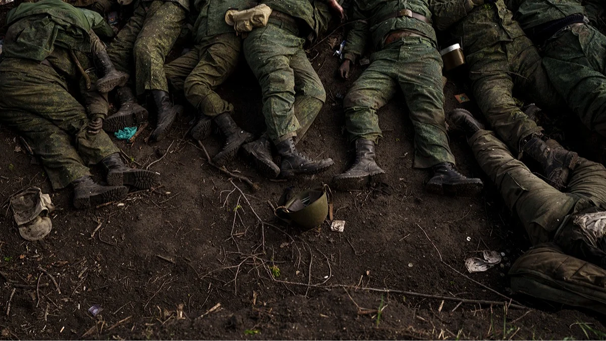 Тела 11 российских солдат на земле в селе Ольховка под Харьковом, Украина, 9 мая 2022 года. Фото: Felipe Dana / AP / Scanpix / LETA