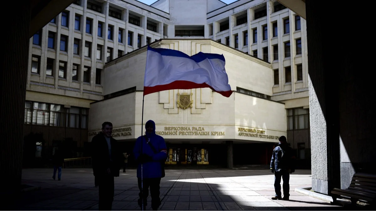 Люди с флагом Крыма перед зданием парламента в Симферополе, 17 марта 2014 года. Фото: Jakub Kaminski / EPA