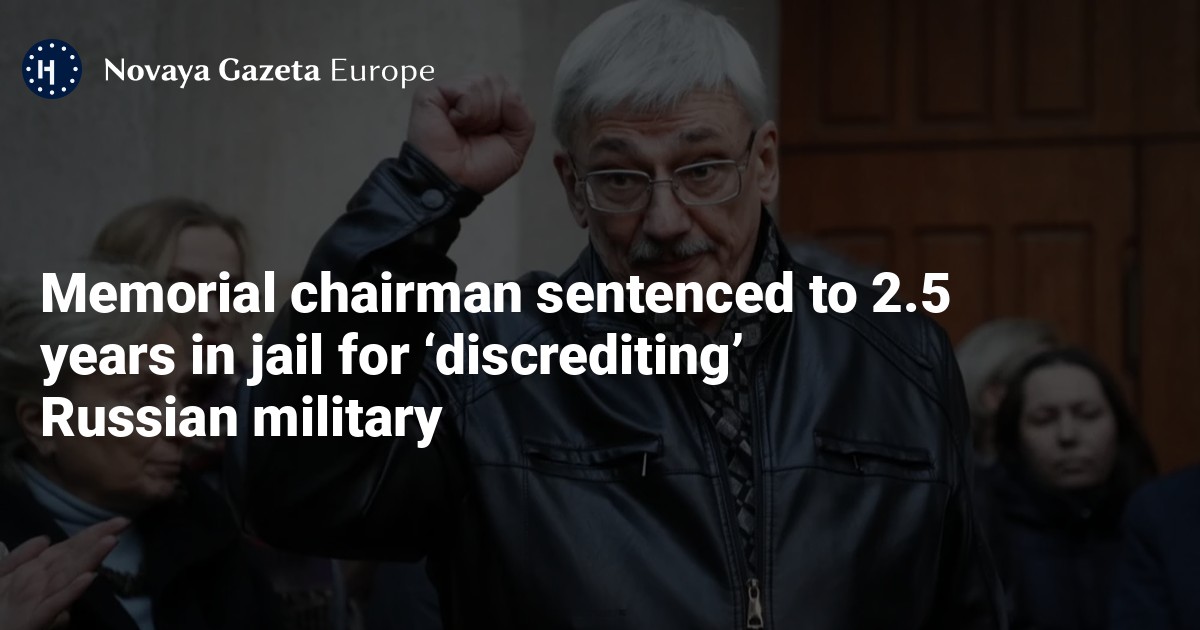 A Moscow court sentenced the co-chairman of the Nobel-prize-winning organisation Memorial to 2.5 years in prison on Tuesday after finding him guilty of “discrediting” the Russian military, Telegram channel SOTAVision reported on Tuesday.