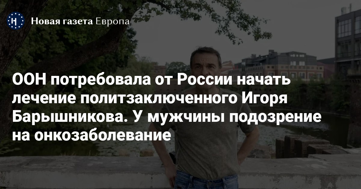Комитет по правам человека (КПЧ) ООН обязал российские власти предоставить политзаключенному Игорю Барышникову «всеобъемлющий и надлежащий медицинский уход» и медпомощь, а также «обеспечить неприкосновенность его жизни и психики». Об этом пишет «ОВД Инфо» со ссылкой на адвоката Барышникова Марию Бонцлер.
