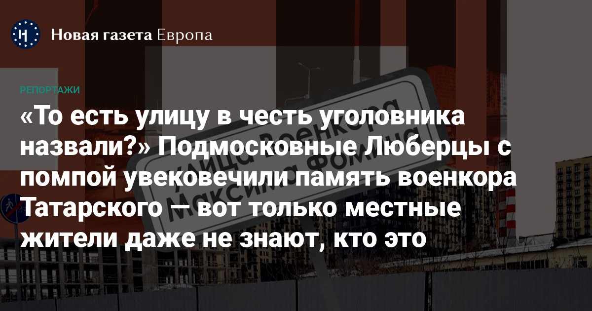 Решение люберецких властей назвать в честь убитого военкора Владлена Татарского одну из улиц города наделало много шума в Z-каналах. Татарский прожил в Люберцах около трех лет до начала войны, и, по заверению главы городского округа Владимира Волкова, «его любили и хорошо знали». После гибели Татарского назвать улицу в его честь просили будто бы даже ветераны Великой Отечественной войны. Проголосовать за такое решение успели и муниципальный Совет депутатов, и Оргкомитет «Люберцы 400» — эту структуру создали для подготовки мероприятий в честь 400-летия города. Вот только корреспонденту «Новой-Европа» не удалось встретить в городе ни одного человека, которому хотя бы было знакомо имя убитого военкора.