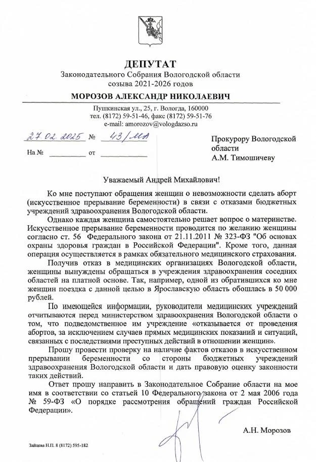 Writing to the Vologda regional prosecutor, Morozov, himself a former doctor, stressed that denying women abortions was illegal under Russian federal law and urged the prosecutor’s office to investigate the matter.