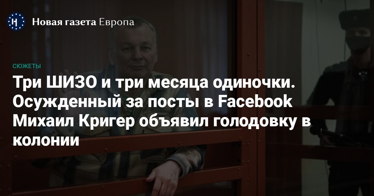 ШИЗО должно закончиться 9 октября. Михаил объявил голодовку: со слов адвоката, как раз до 9 октября. Если его раньше вернут в общий барак, начнет есть. Странная ситуация: обычно люди, которым угрожают, не стремятся вернуться к угрозе, — рассказал «Новой газете Европа» один из родственников Михаила Кригера.