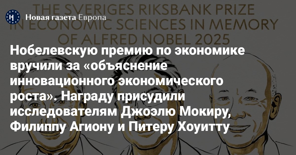 Нобелевскую премию по экономике вручили историку Джоэлю Мокиру и экономистам Филиппу Агиону и Питеру Хоуитту. Об этом сообщили в Нобелевском комитете.